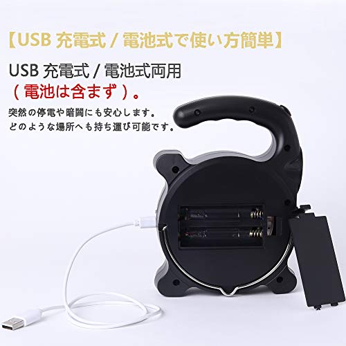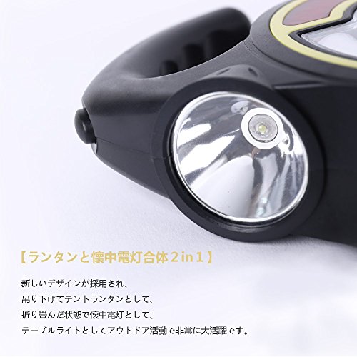 LEの充電式LEDランタンです。電源は2通りで、乾電池とUSB充電で、USB充電用に車載充電器とUSBケーブルも付属しています。最大の特徴は、2本の懐中電灯を内蔵しており、引き抜いて使用できます。もちろん、テーブルの上やテントでも使用できます。明るさは最大600ルーメンで、使用するには十分といえます。