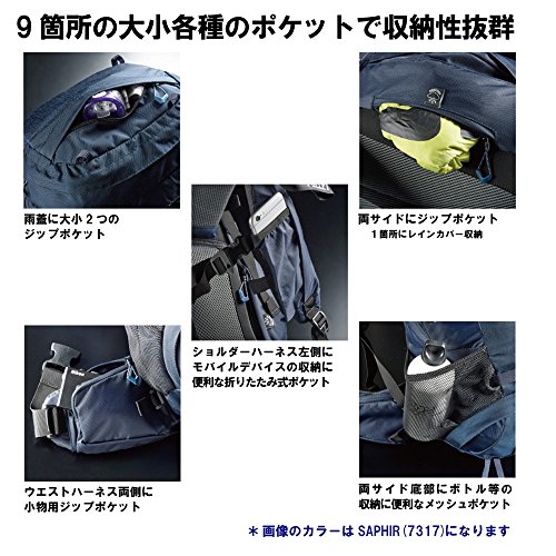 雨によって内部の大切な荷物が濡れるのを防ぐ防水仕様となっていますので、万が一登山中に悪天候に見舞われたとしても安心して背負っていられる登山用リュックです。収納力抜群ながらも2.3kgと比較的軽量なので、登山初心者にも携行しやすいです。ショルダーストラップ以外にもチェストストラップやウエストベルトも採用し、リュックをバランス感良く携行する事が出来ますので、長時間の登山時も体への負担も少ないです。