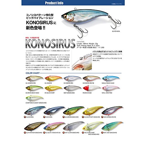 コノシロパターンを強く意識した大型バイブレーションです。108mm、体高もあって大きめのシルエットですが、33gと強めのセッティングであれば、スタンダードなタックルでもキャスト可能なウェイトに仕上がっています。コノシロパターンは群れの横、下を通すのがポイント!ヘビーなルアーを使って、群れの外でエサを待つシーバスにアプローチしてください!