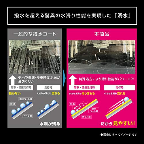 このコーティング剤は、撥水性と親水性を掛け合わせた滑水性を持っています。雨がたくさん降ってきても、フロントガラスを水がすぐに滑り落ちて、視界が狭まる事が無くなります。いつでも視界良好で、運転をより円滑に行う事ができます。