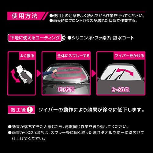 このコーティング剤はフロントガラスの保護と撥水加工、油膜の除去を一緒に施工できて、とても便利です。初めてコーティングを行う人もほとんど手間取らずに済み、短時間で終わらせられます。耐久性は約3か月で、定期的に塗り直さないといけないですが、塗るたびにコーティングの力はより強まり、しっかりと水をはじく事ができるなどの充分な効果をより期待できます。