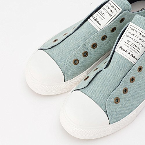 人気ブランドパープル&イエローのキャンバスデニムスニーカーは、紐無しで履けるデザインがおしゃれなのスニーカーで、履き心地が良く紐も付属で付いていて紐ありと2パターン楽しめます。カジュアルなデニムコーデにピッタリです。
