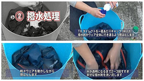 30リットル程度のバケツにぬるま湯をはり、洗濯が終わったレインウェアをつけ込みます。分量を計った撥水剤を投入し約10分浸します。あとはすすぎ残しのないよう念入りにすすいで下さい。タオルで拭き取っても構いません。すすぎ終えれば自然乾燥か、乾燥機での熱処理を経て完了です。