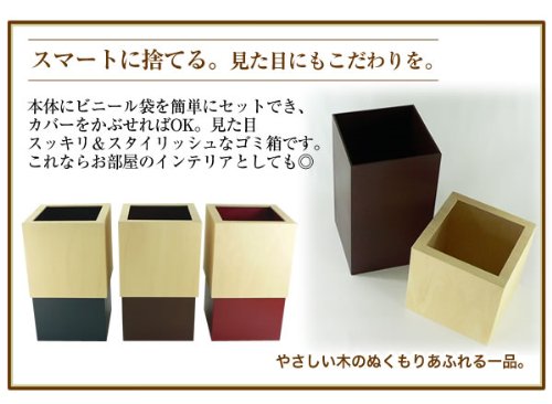 ゴミ箱の上部、下部と異なる色と木目調を採用しているおしゃれなキューブ型のゴミ箱です。