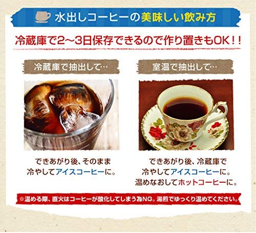 水出しアイスコーヒーは、水を入れたときは薄めの色をしていますが、徐々に色がしっかり付いていきます。水出しアイスコーヒーは、コーヒー豆と水の分量をきちんと守れば美味しくできる、本当に簡単なステップだけです。
