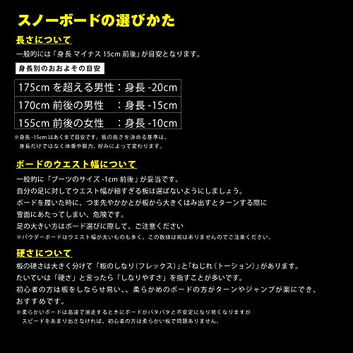 このスノーボードのサイズは149cm、152cm、154cm、156cmの4つです。価格は35000円~36500円の間になっていて、他のメーカーの物よりも安く、とても購入しやすいです。色は黒を基調としていて、乗っている人のかっこよさをより引き出します。