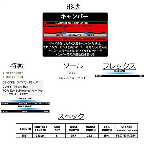 それとこのスノーボードは、アクティブキャンバーとトリプル複合サイドカットの2つを搭載しています。その事により接雪点のプレッシャーをある程度まで弱める事ができて、足元のグリップ力と操作性を確かな物にしています。より安定して滑る事が可能で、怪我などもせずに済みます。フリーライディングからいろいろなトリックにも対応しています。