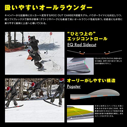 このスノーボードはEQ Radとロックアウトキャンバーを装備しており、エッジの制御を上手くできます。他のメーカーの物と比べるとコントロールをしやすく、スピードが出過ぎる事を未然に防げるので、怪我などの可能性も少なくなります。安心感があり、特に初心者におすすめで、スノーボードに慣れるには丁度良いです。