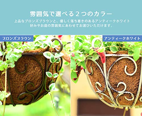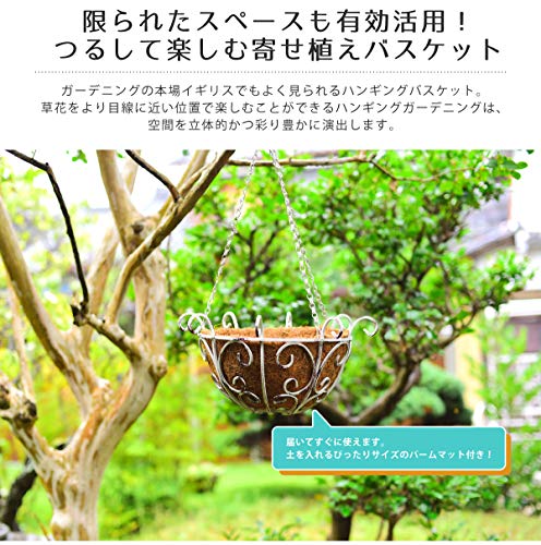 アンティークなアイアンタイプのものは、人目を引き、玄関に吊り下げれば素敵な庭作りができます。ココヤシマットや麻布を敷いてから土を入れて植え込みましょう。水やりの時は一度地面に降ろしてからあげると、服が汚れません。