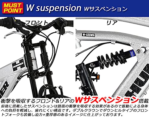 出典: https://www.amazon.co.jp/HUMMER-%E3%83%8F%E3%83%9E%E3%83%BC-AL-ATB2621Wsus-%E5%89%8D%E5%BE%8CV%E3%83%96%E3%83%AC%E3%83%BC%E3%82%AD%E3%82%B7%E3%82%B9%E3%83%86%E3%83%A0-13192-0799/dp/B074PXWDYR/ref=sr_1_2?ie=UTF8&qid=1537923849&sr=8-2&keywords=%E3%83%9E%E3%82%A6%E3%83%B3%E3%83%86%E3%83%B3%E3%83%90%E3%82%A4%E3%82%AF%E3%80%80%E3%83%95%E3%83%AB%E3%82%B5%E3%82%B9%E3%83%9A%E3%83%B3%E3%82%B7%E3%83%A7%E3%83%B3&refinements=p_89%3A%E3%83%8F%E3%83%9E%E3%83%BC%28HUMMER%29フレーム素材には軽量なアルミフレームを採用しています。フロント、リアのフルサスペンション仕様のMTBなので、砂利道や路面の荒れた道を走る際も、振動が体へと伝わりにくく、バランス感良く走行する事が可能となっています。