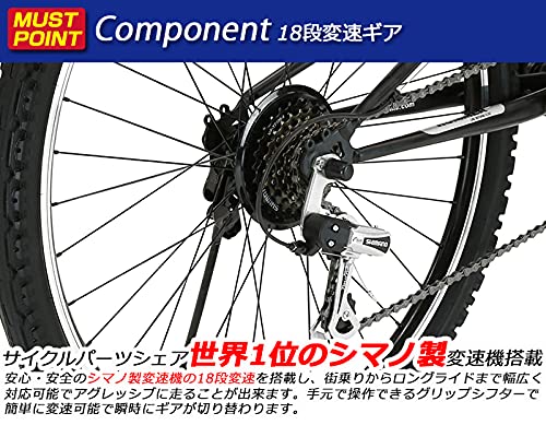 MTBの上位機種に搭載されているシマノ製のラピッドファイヤシフトレバーが採用されて、スムーズな変速操作を可能とし、シマノ製の24段変速ギアにより、シーンに応じてスピード感良く走行できます。