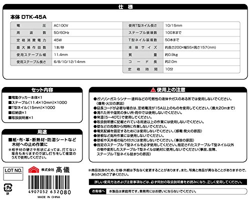 メーカー:高儀 型番:DTK-45A コの字、T字両方のステープルを打ち付け可能