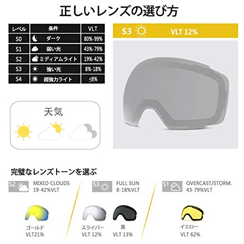 このスノーボードのレンズは紫外線を99%以上遮断するUVカット仕様になっていて、自分の目をしっかりと未然に守る事ができます。スノーボードをしている際に、空を見上げても大丈夫です。その他には曇り止め加工も施されており、使っている時に目の前が曇らずに済みます。視界がよりクリアになり、滑りやすさも向上します。表面にはミラーコーティングもされていて、日差しが強い時でも眩しくならないです。