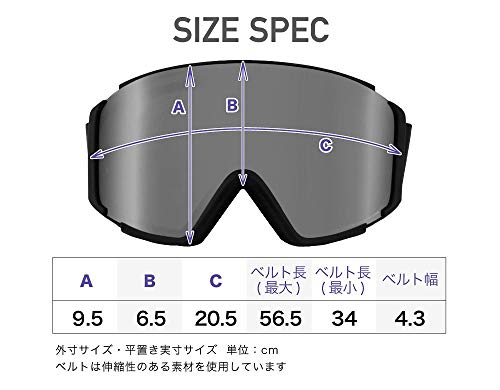 このゴーグルのサイズは幅20cm、高さ8.3cmです。色はシルバーやイエロー、ブルーなど5種類あります。ポリカーボネ―ト素材で作られているので、耐久性や耐衝撃性に優れていて、壊れる心配はほとんどないです。雪山でスノボをしている時に転んでも大丈夫で、目を傷つけずに済みます。スノーボードをよくしている人からの評価・評判も非常に高いです。値段も約1300円と安いので、購入してみて損はないです。