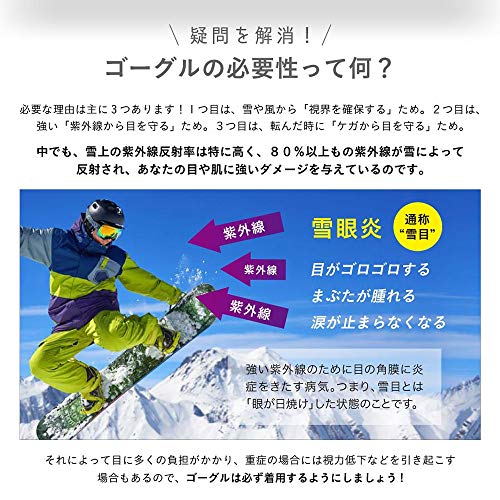 このゴーグルのレンズの内側には特殊な加工が施されており、曇る事を未然に防ぐ事ができます。曇りはスノーボードをする時に厄介な物なので、未然に防げる事はとても大きいです。紫外線も99%以上しっかりとカットできるようになっていて、目にダメージを与えずに済みます。