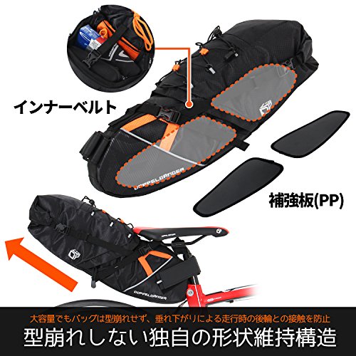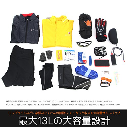 ドッペルギャンガーから販売されている大容量で収納力に優れたサドルバッグになります。最大で13Lの備品を収納できる大容量設計なので、サイクリング時に必要なグローブやウェア類、パンツや替えの靴下などの他、様々な備品を持ち運びできます。