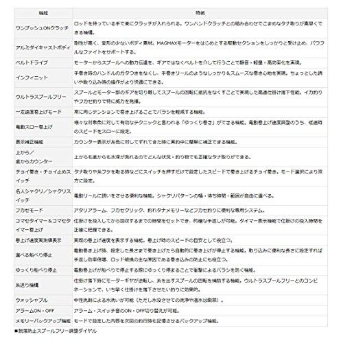 パワーモードとスピードモードの切り替えにより1台2役の高性能になってモデルチェンジして登場しました。前のモデルと比較すると片手で操作可能なJOGパワーレバー、強烈な巻き上げを可能にしたMAGMAXモーターを搭載するなど、モデル名は一緒ですが中身はフルモデルチェンジと言って間違いない高性能な電動リールです。