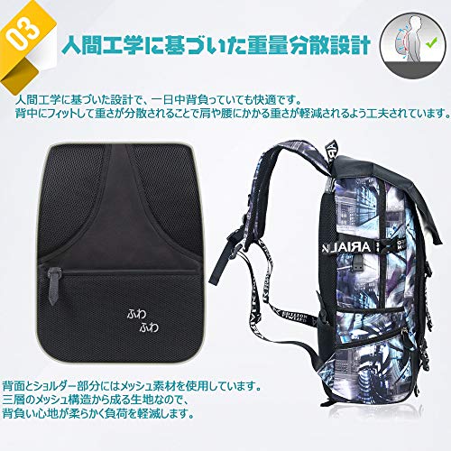 そしてこのリュックの背面とショルダーバックにはメッシュ・クッション素材が使用されていて、通気性と耐汗性の機能に特に優れています。リュックを背負っていてもあまり汗をかかずに済み、汗による特有の不快感も無くなります。