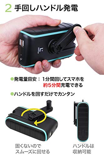 日光を使うと約10時間で満充電となります。USBアダプターを使って電源からも充電できますし、手回し発電ハンドルを備えているので自力で発電が可能です。