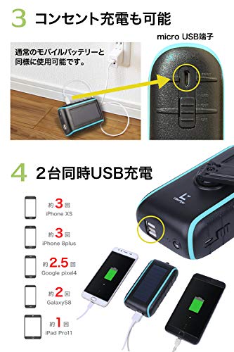 口コミでも人気のアウトドアでの機能性を重視したモデルです。スマホを4回以上充電できます。タブレットも2回ほど充電ができます。USB出力2ポートを備えているので、同時に2台のスマホに充電可能です。また最適な充電をするために電流を制御する機能が付いています。アウトドアで使用するために必要な防水性や防塵性に加えて、衝撃から守るためのカバーが付いているため耐久性もあります。LED懐中電灯、SOS信号灯の機能を持っていますので、災害時にも威力を発揮します。