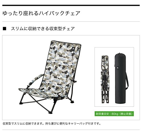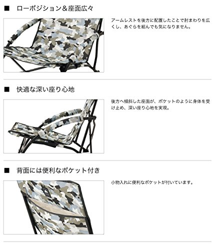 国内ブランドのロゴスより、あぐらもかける座面のローチェアです。座り心地は良く、背もたれが長いので深く腰かけて足を伸ばして座れます。ミリタリー柄がおしゃれで、アウトドアファンに好まれます。