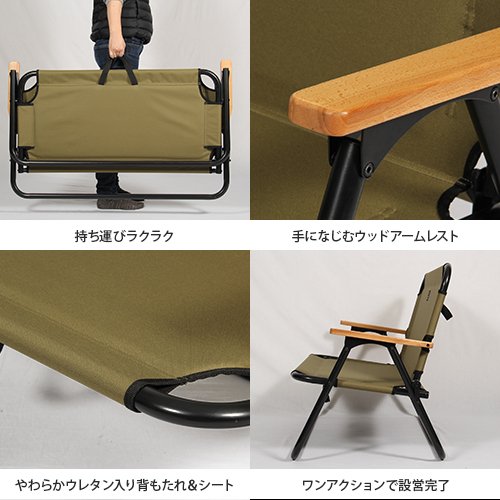 竹の集成材を使用した肘掛と落ち着いたフォルムが魅力の、高級感と自然素材が融合したモダンな佇まいの製品です。快適な座り心地が魅力で、背もたれが長いのでゆったりと座れます。座り心地はトップクラスで、キャンプ以外にもご自宅のテラスなどでも使用する方もいます。