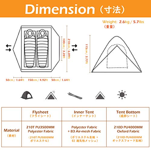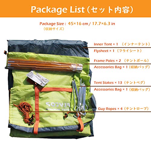 75Dリップストップナイロン構造なので、耐久性が高く、長期間の使用に対応しています。メッシュ窓が2つついており、ドアと同様に開けば常にテント内の空気を入れ替えることが可能です。また、必要なキットはすべて付属しています。