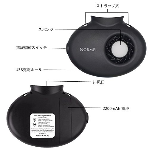 首かけ扇風機 Normei 携帯扇風機 ミニ超小型携帯乾電池USB充電式フアン USB給電/充電電池 風量無段階調整 強力 静音 省エネスポンジ ストラップ付き アロマオイルで使え フォーム 野外フェス 農作業用 とに送風 熱中症 暑さ対策 オフィス 野外活動 小型 2200mAhバッテリー(ブラック)