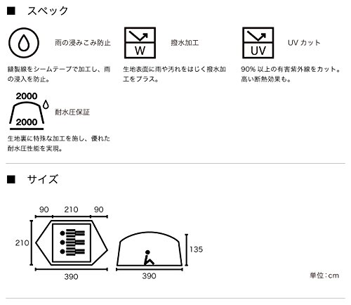 素材:フライ/75Dポリエステルタフタ、インナー/68Dポリエステルタフタ、フロア/210Dポリエステルオックス、ポール/アルミ合金・FRP
