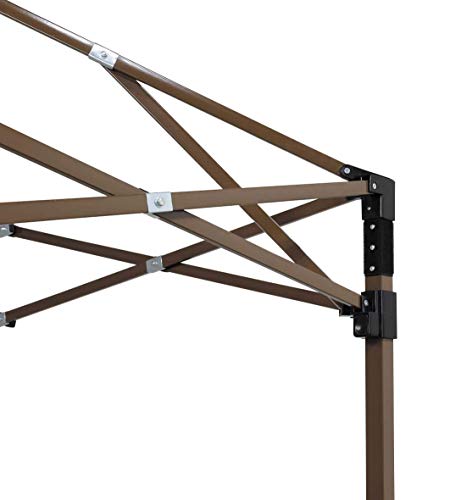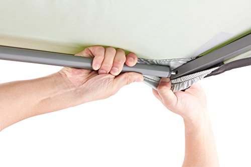 フレーム上部の肩口部分はプッシュボタン式を採用していますので、タープの設営に不慣れな方にも安全に組み立てる事ができます。フレーム表面部分には有害な紫外線を防ぐ、UV加工が施されています。