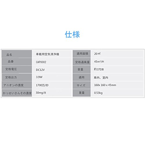 出典: https://www.amazon.co.jp/OKNAE-%E9%99%A4%E8%8F%8C%E6%B6%88%E8%87%AD2in1-USB%E3%82%AB%E3%83%BC%E3%83%81%E3%83%A3%E3%83%BC%E3%82%B8%E3%83%A3%E3%83%BC-%E3%82%B7%E3%82%AC%E3%83%BC%E3%82%BD%E3%82%B1%E3%83%83%E3%83%88%E7%94%A8-PM2-5%E3%82%92%E9%99%A4%E3%81%8D/dp/B07C2QFWX5/ref=sr_1_21?ie=UTF8&qid=1540859613&sr=8-21&keywords=%E8%BB%8A%E3%80%80%E6%B6%88%E8%87%AD輸入電圧 / 12V/DC