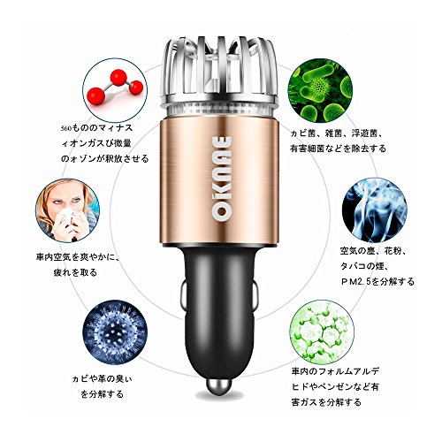 OKNAE 車載空気清浄器 空気清浄機 イオン発生器 脱臭機 除菌消臭2in1 USBカーチャージャー(5V/2.1A 2ポート) シガーソケット用 エアクリーナー タバコの煙/空気の塵/花粉/PM2.5を除き 静音