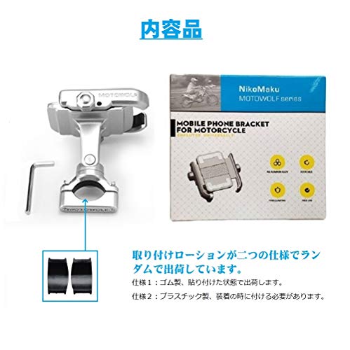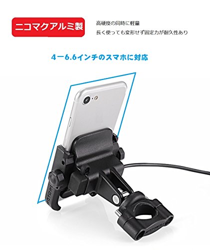 出典: https://www.amazon.co.jp/NikoMaku-%E3%82%B9%E3%83%9E%E3%83%9B%E3%83%9B%E3%83%AB%E3%83%80%E3%83%BC-USB%E9%9B%BB%E6%BA%90%E4%BB%98%E3%81%8D-%E3%83%8F%E3%83%B3%E3%83%89%E3%83%AB%E3%81%AB%E5%8F%96%E3%82%8A%E4%BB%98%E3%81%91-4~6-6%E3%82%A4%E3%83%B3%E3%83%81%E6%90%BA%E5%B8%AF%E3%81%AB%E5%AF%BE%E5%BF%9C/dp/B07FFRK6N9?psc=1&&SubscriptionId=AKIAIAN4UFBEXLLXVFHQ&&tag=kurashino0b-22&&linkCode=xm2&&camp=2025&&creative=165953&&creativeASIN=B07FFRK6N9ニコマク スマホホルダーのおすすめポイントは高級感あふれるデザインです。アルミ製の本体はハンドル周りのデザインに調和しやすいといえます。ユーザーレビューを確認すると、確実に固定できているユーザーとそうでないユーザーがいますので、スマホの形状に左右されるスマホホルダーだといえます。スマホが脱落しないようにゴムリングで固定したくなりますね。