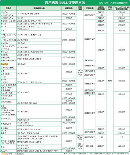 チョウ目に即効で効果を発揮する殺虫剤です。その他、アザミウマやハエなどにも防除効果があります。ただし、同じ農作物に対して使えるのは2回までですので気を付けましょう。