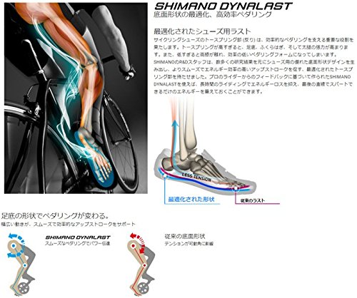 さまざまな技術が注ぎ込まれてデザインされるシマノのサイクルシューズ。例えばスタックハイトを低くして足底とクリートを近づけたり、ワンピース構造を用いたりして、軽量性とダイレクトなペダリングフィールを追求しています。足全体を包み込むようなアッパーとシマノ独自の足底形状であるダイナラストは高いフィット感を生み出し、モデルごとにソールの剛性を細かく設定することによってライダーにかかわらず快適性をもたらしてくれます。