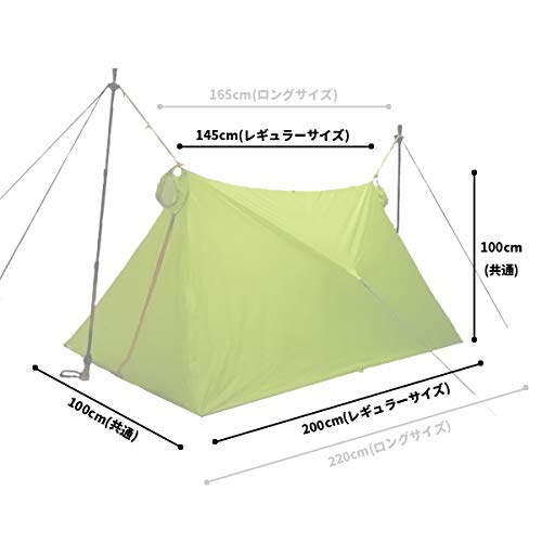 設営が完了すれば、奥行きで200cm、間口で100cmあるので、大人が横になって寝るスペースをシッカリ確保することができます。内部での高さも98cmあるので座って過ごすのにも苦痛をもたらすこともなく、パッキングしたときの大きさに至っては、10cm×18cmとコンパクトに収まってくれ、重さも475gと軽量になっているので持ち運びも気になりません。