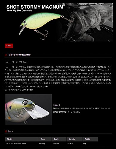 ショットストーミーマグナムを紹介している動画です。手に取った時のサイズ感はもちろん、実釣の様子を通して詳しく解説されています。沈んだ藻、岩など障害物に絡めた使い方が基本。ロッドはヘビーなものが必要になりますが、ラインは16lbでOK、投入のタイミングも普通のクランクに近いイメージで楽しめるようです。大型ベイトが気になったら、マグナムクランクを投入です!