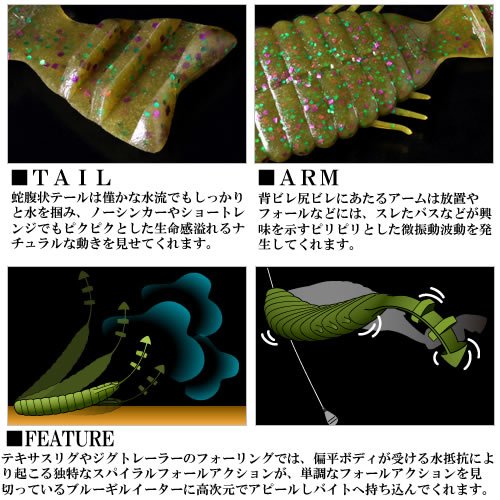 独立した川村光大郎氏率いる、ボトムアップの2018年新作アイテムです。プレッシャーの高いエリアを攻略できるリアルなルックスと弱めのアクションが特徴。匂い付きの素材と合わせて、フィネスな釣りをサポートします。4インチから展開がスタートし、10月には3インチもラインナップ。テールカットによるサイズコントロールと合わせて、釣りきれなかったバスを攻略してください!