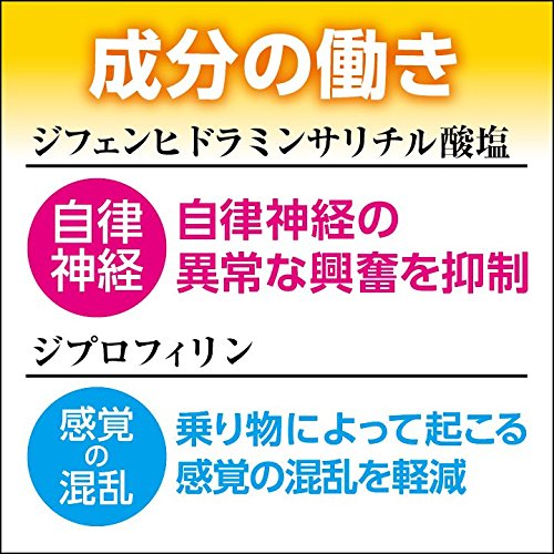 ジフェンヒドラミンサリチル酸塩・45㎎(自律神経に働き、乗りもの酔い症状を予防・緩和します)、ジプロフィリン・45㎎(揺れによって起こる感覚の混乱を抑制し、乗りもの酔いを予防しま