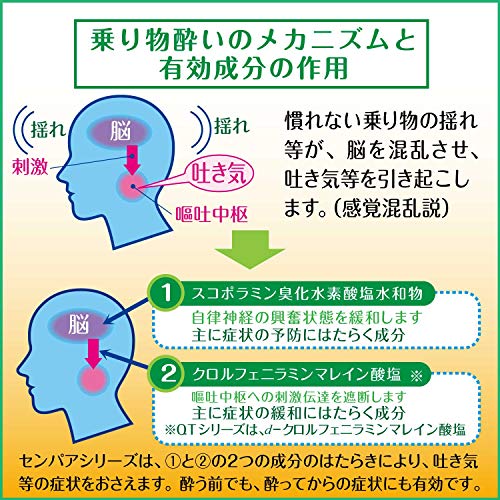 ジフェンヒドラミンサリチル酸塩・20㎎(自律神経に働き、乗りもの酔い症状を予防・緩和します)、ジプロフィリン・13㎎(揺れによって起こる感覚の混乱を抑制し、乗りもの酔いを予防します)