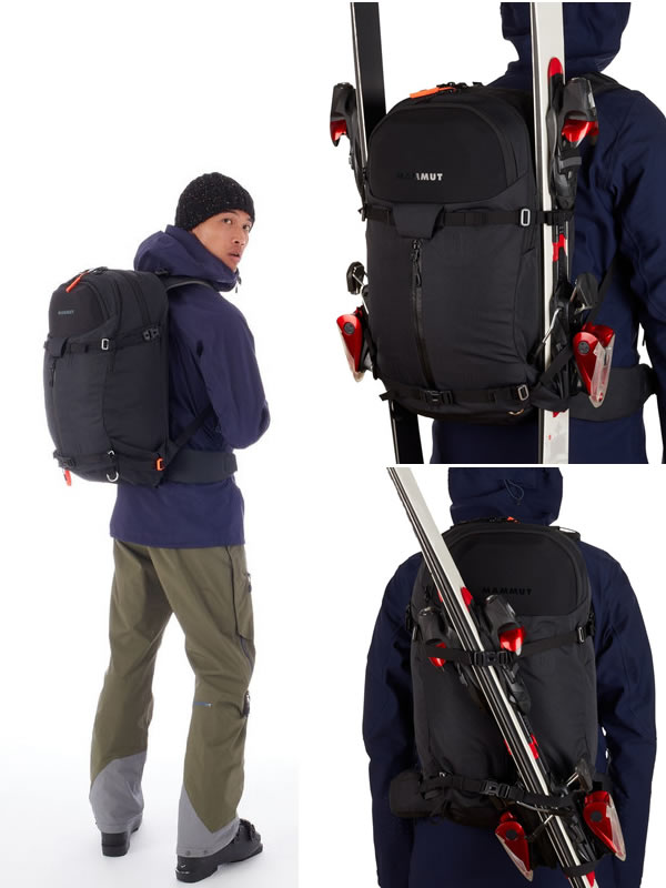 スキーとスプリットボードは、ダイアゴナルまたはAフレームで取り付けができ、スノーボードは垂直に取り付けることが可能。雪山で活躍する、本格的なバックパックになっています。