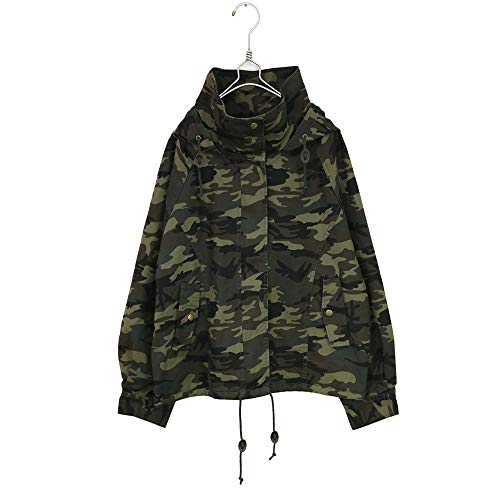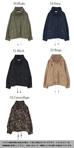 迷彩柄とシンプルな無地のカーキカラーの2色から選択出来る口コミ評判も高い人気のレディース用ミリタリージャケットです。首元には冷気の侵入を防げるように衿元を立てて留められるスナップボタンがついていて、シーンに応じて衿元を広げて着用する事もできて、コーデのアレンジ自在なミリタリージャケットです。