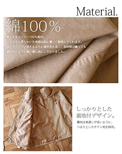 素材には柔らかな風合いのコットン生地を採用しており、心地良い肌触りが魅力的で、長時間着続けていても疲れにくい軽い着心地のミリタリージャケットです。裏地は袖通しを良くする為、つるりとしたサテン地を採用しているのも特長のミリタリージャケットです。