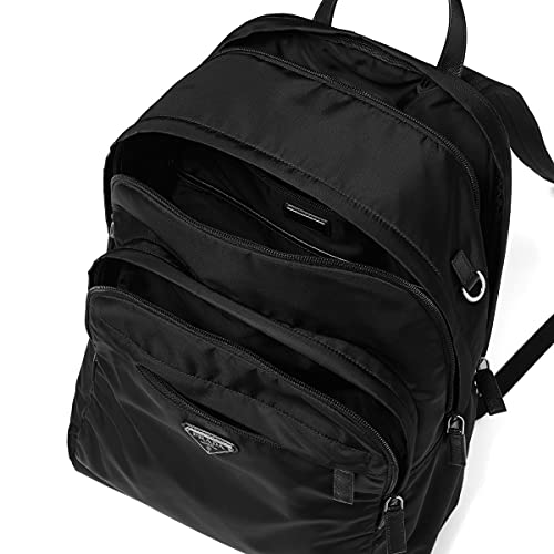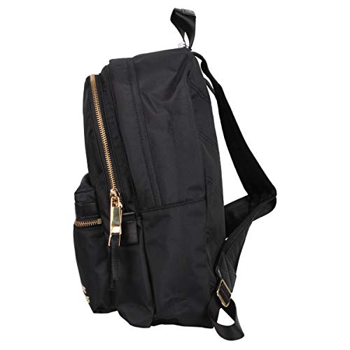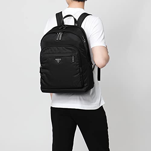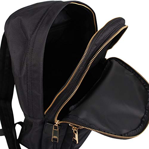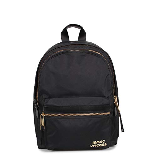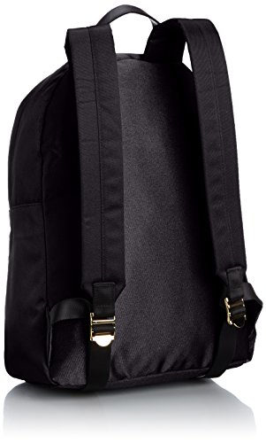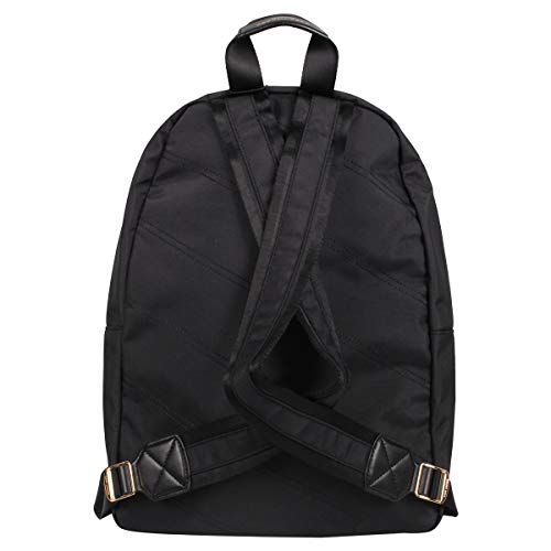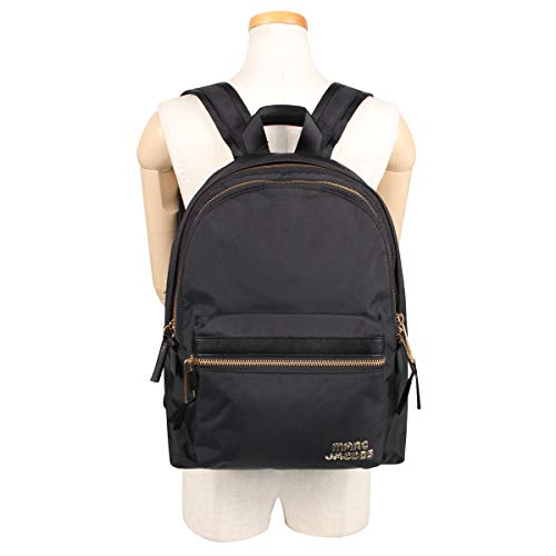 ブラックの無地ナイロンに三角ロゴプレートがスタイリッシュなバックパックです。ダブルファスナー開閉でA4サイズも入り、背面のファスナー収納や前面・内部の多彩なポケットなど収納力抜群。背面は通気性の良いメッシュ素材で、ベルトループ付き。通勤通学から普段使いはもちろん、旅行などマルチに大活躍です!