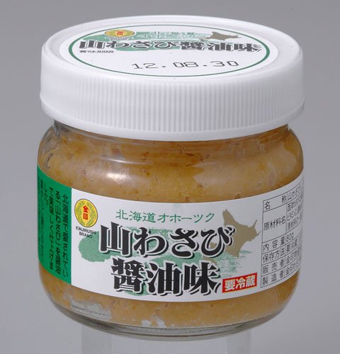 北海道民ならだれもが知っているパッケージ、オリオン食品(株)の「山わさび醤油漬」をご紹介します。山わさびとは北海道内に自生する「西洋わさび」のことで、緑色の本わさびとは少し違います。ローストビーフの付け合わせに添えられる白い薬味が山わさびです。すり下ろすとツンと辛く、自然の香りのするわさびです。北海道民は冷ややっこに乗せたり、刺身と食べたり、ごはんに乗せたりと様々な食材に山わさびを添えます。それがスーパーでも売られている理由になります。