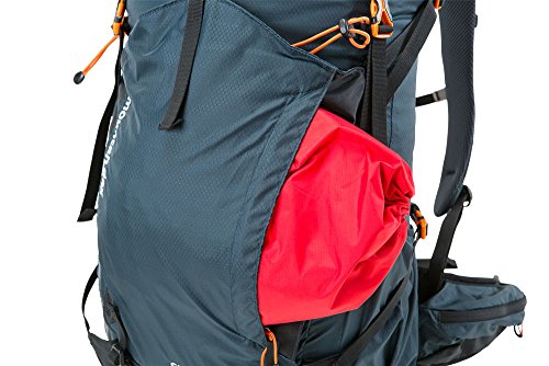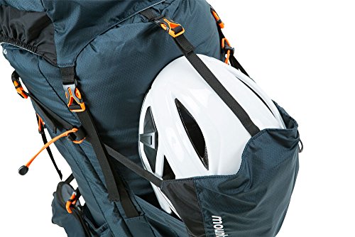 フロント部分には頭を保護するヘルメットや寝袋の収納に便利なフロントフラップポケットがあります。メイン収納スペースへのアクセスができるサイドジッパーも付いていて、荷物の取り出しもスムーズに行えます。背面バックパネルには通気性を保つためのメッシュ生地を採用しており、長時間快適に背負うことができる登山リュックです。