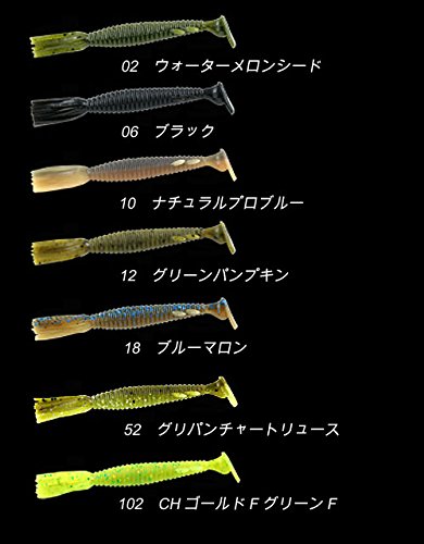 ウォーターメロンシードは基本的なカラーは「霞ジンゴローム」と似ていますが、ウォーターメロンシードのほうがやや黄緑寄りで、より濁った水質になじみやすいカラーとなっています。霞ジンゴロームとの違いは「僅かに黄色っぽいか/青っぽいか」位ですが、水中ではこの僅かな色の違いでもインプレが微細に変化します。霞ジンゴロームでバスの反応が薄い時の「予備」とする使い方がおすすめです。
