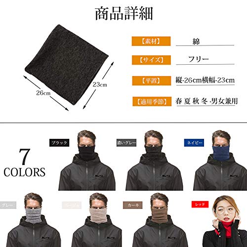 このネックウォーマーのサイズは縦29cm×横30cmで、色はグレーやネイビー、カーキなど8種類あります。種類が豊富なので、かっこいい系・可愛い系どちらの服にも合わせやすく、他のブランドのネックウォーマーよりもおしゃれに決める事ができます。男女兼用な所も非常に良く、誰でも気軽に使えます。価格も手ごろなので若い人も手に取りやすく、高い人気を誇っています。