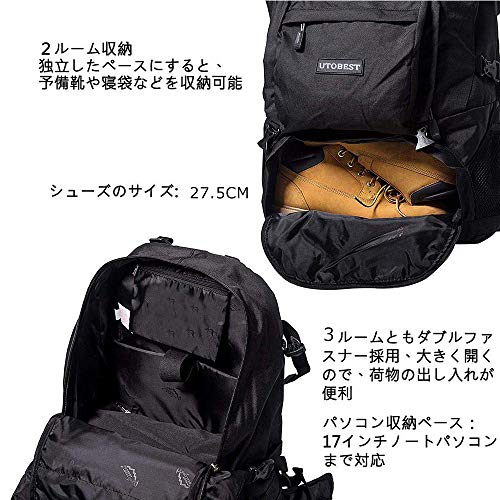 UTOBEST 登山リュック 60L大容量バックパック 旅行用アウトドアリュック 防水 通気 独立靴用コンパートメント レインカバー付き(ブラック)