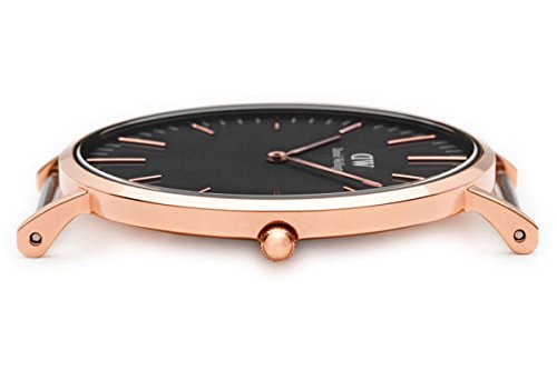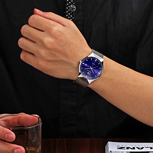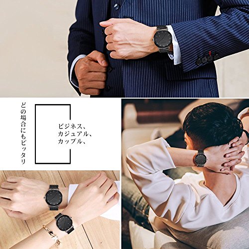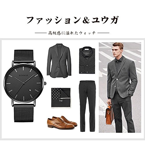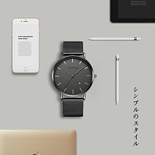 Ronmar 腕時計 超薄型 軽量 亜鉛合金ケース ステンレス製のブレスレット 30M防水 日付表示 男女兼用 ブラック